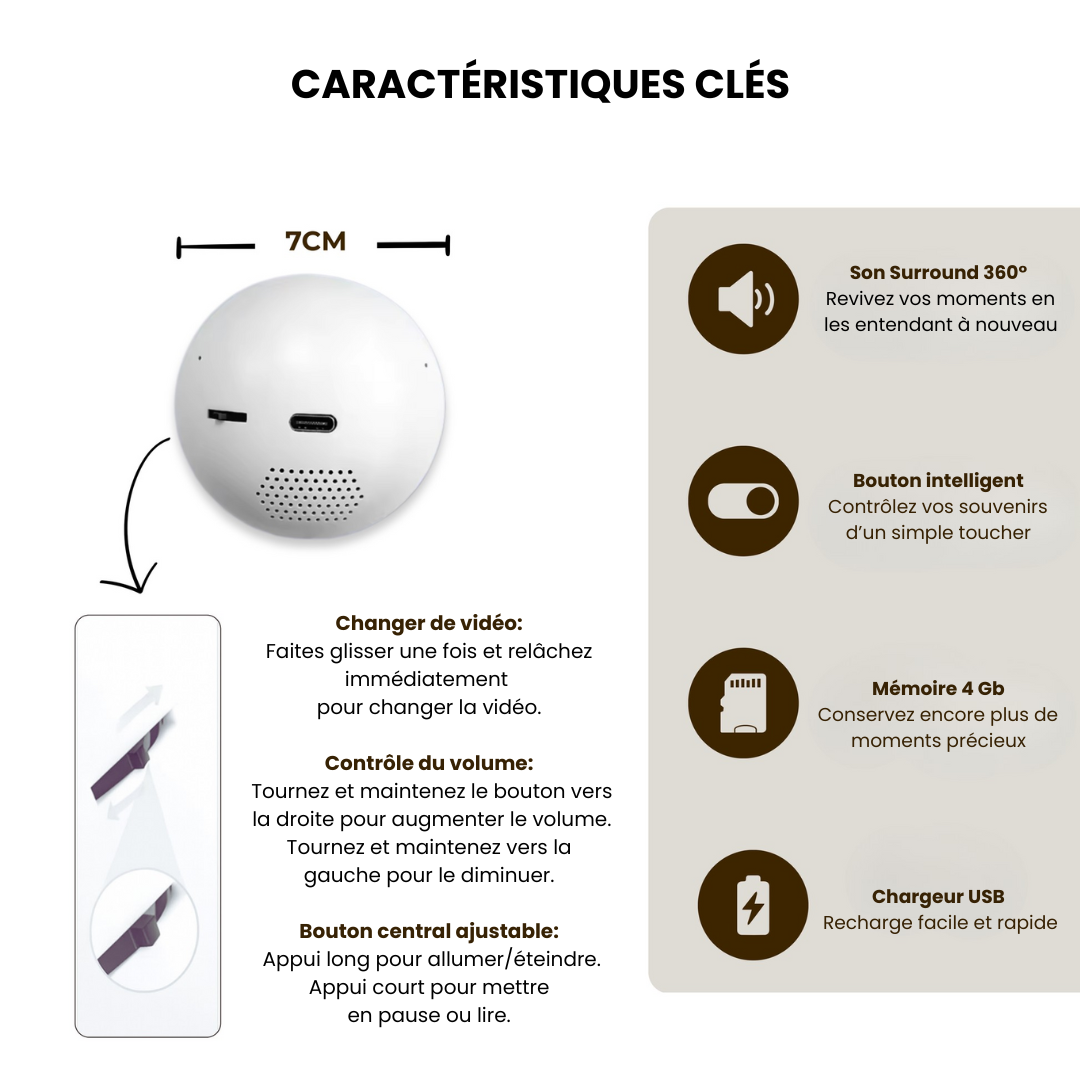 Videosphere est équipée d’un écran haute résolution de 2,1 pouces intégré dans une sphère en verre lumineuse, offrant des images éclatantes et une lecture vidéo immersive avec son.